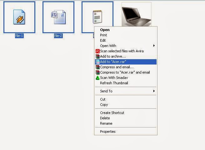4. Drag semua file yang ingin disembunyikan kecuali file gambar, klik kanan file yang di drag tersebut dan compres dalam bentuk Rar atau Zip.